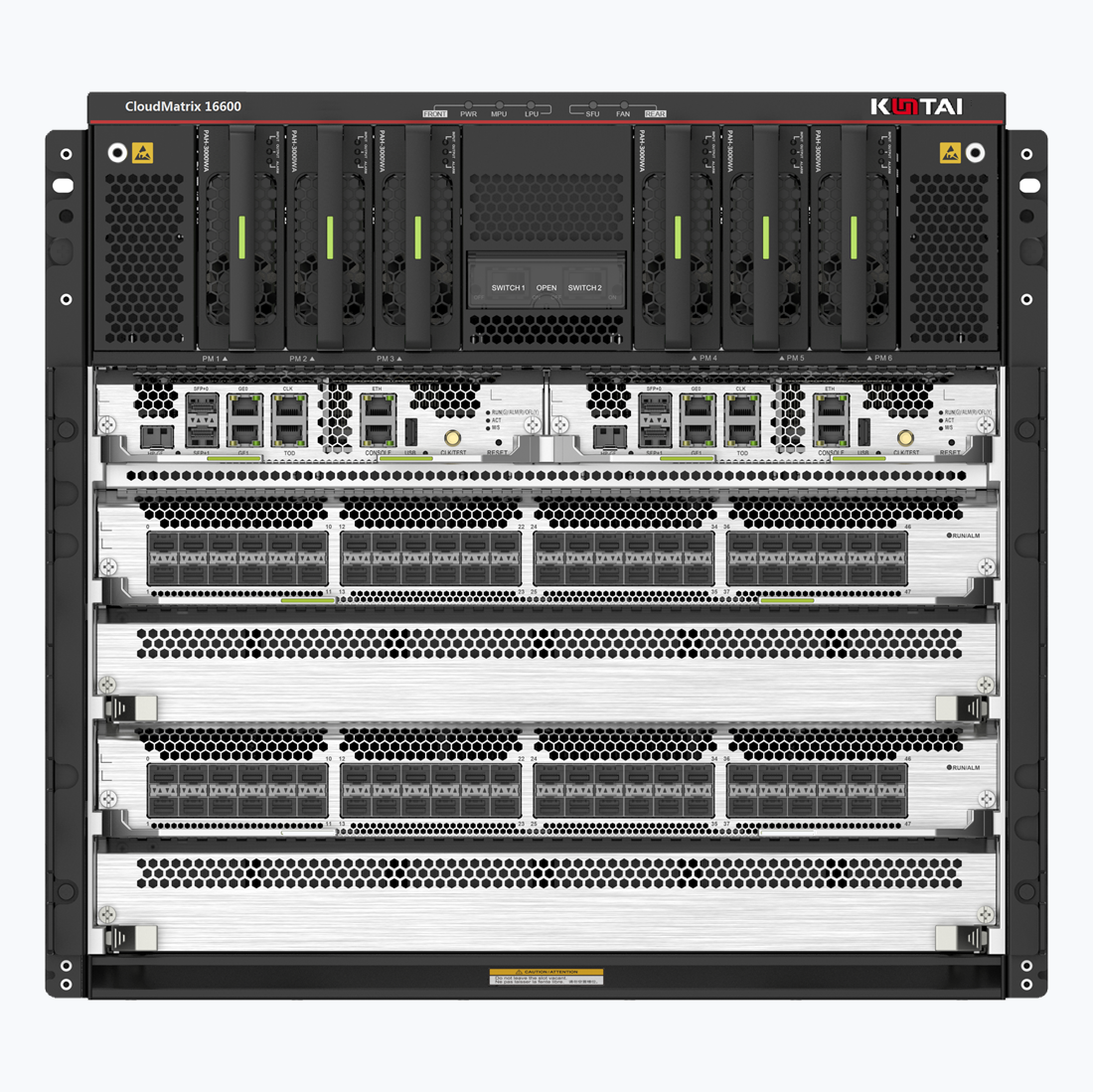 CloudMatrix 16600系列采用先进的硬件架构设计。整机最大支持4821Tbps交换容量,当前最高支持238个400GE、1152个100GE、1152个40GE或10GE全线速接口,单板支持2GB缓存,整机最大支持8GB-16GB缓存。